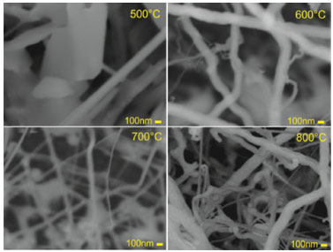 ![]() Figura 2. Imagens por microscopia eletrônica de varredura de nanofios de germânio crescidos a partir do cobre, sintetizados em diferentes temperaturas
