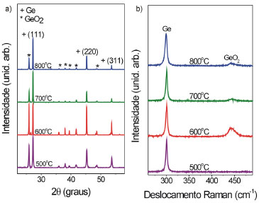Em relação à estrutura e composição, a análise por raio-X e espectroscopia Raman dos substratos com nanofios sintetizados em diferentes temperaturas mostraram resultados bastante semelhantes, como pode ser visto nos gráficos da Figura 3. Em todos os casos o padrão de raio-X (Figura 3a) obtido destaca os picos (111), (220) e (311) do germânio em estrutura diamante em concordância com o cartão de difração PDF 4-545.16 Também apresenta picos relativos ao óxido de germânio em estrutura hexagonal em concordância com o cartão de difração PDF 36-146317 e não indica a presença de nenhuma impureza nas amostras. Em concordância com estes resultados, os espectros Raman (Figura 3b) apresentaram um pico intenso centrado em 300 cm-1, atribuído aos fônons ópticos do germânio em estrutura diamante, e um pico de menor intensidade com centro em 443 cm-1 relacionado à vibração A1 da fase α-quartzo do GeO2.18