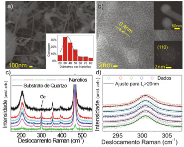 Tendo em vista que o crescimento ocorreu de forma satisfatória em temperaturas entre 700 ºC e 800 ºC, produzindo nanofios de germânio cristalino, passou-se à reprodução e melhoria dos procedimentos para uma análise mais acurada das propriedades de nanofios individuais. O estudo estatístico dos diâmetros dos nanofios, apresentado no histograma inserido na Figura 4a, realizado a partir de imagens geradas por FEGSEM como a da Figura 4a, permitiram verificar o fato de que os nanofios possuem diâmetros compatíveis com o diâmetro das nanoesferas catalisadoras, uma característica do processo de síntese por VLS. De forma mais precisa, os diâmetros dos nanofios variaram de 20 nm a 80 nm, com a grande maioria possuindo diâmetros entre 30 nm e 50 nm. Ainda que os substratos aparentem menor uniformidade que sínteses similares realizadas utilizando ouro como catalisador,7 a variação nos diâmetros dos nanofios crescidos com cobre ou ouro é estatisticamente semelhante.