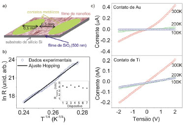 ![]() Figura 5. a) representaçao esquemática do dispositivo construído pela evaporaçao de contatos metálicos sobre filme de nanofios em substrato de SiO2 b) exemplo de curva de resistência em funçao de temperatura com ajuste pelo modelo VRH para dispositivo de nanofios de germânio crescidos a partir do cobre; gráfico dos valores de Rhopping obtidos para sete diferentes dispositivos c) curvas de corrente em funçao de tensao para diferentes temperaturas: acima, dispositivo com contato de ouro; abaixo, dispositivo com contato de titânio
