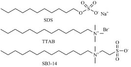 In aqueous solution, polymer-surfactant mixtures form associated thermodynamically stable complexes with physicochemical properties which differ from those observed in micellar media.10-12 The association of a polyelectrolyte with an oppositely charged surfactant is generally accepted to involve an anion exchange process, where the electrostatic attraction is enhanced by the cooperative aggregation of surfactant molecules. Once all charges in the polymer chain are neutralized, the hydrophobic effect begins to control the association, which induces restructuring of the polymer chain due to the formation of complexes with the surfactant.13 Studies on polymer-surfactant complexes show that surfactants can cooperatively interact with the polymer from the critical aggregation concentration (cac), forming micellar aggregates along the polymer. This is the basis for almost all systems that consist of polymers and ionic surfactants.10,14 The values of the cac are lower than those for the critical micelle concentration (cmc) of the surfactant. In these various polymer-surfactant systems,10,15-18 the cac is dependent on the electrostatic forces, the structural characteristics of the charged groups and other factors, such as the flexibility of the polymer chain and of the counter-ions.16,19 At a certain concentration of surfactant, the so-called polymer saturation point (psp), the surfactant no longer forms complexes with the polymer, this concentration being directly proportional to the polymer concentration. Above the psp, regular micelles of surfactant are formed in equilibrium with the polymer-surfactant complexes.20 In this paper, the properties of aqueous systems comprised of PEI and a surfactant were investigated by way of surface tension, pyrene fluorescence, dynamic light scattering (DLS), pH, and zeta (ζ) potential measurements. Three surfactants were used (Scheme 2): an anionic surfactant (sodium dodecylsulfate; SDS), a cationic surfactant (tetradecyltrimethylammonium bromide; TTAB), and a zwitterionic surfactant (N-tetradecyl-N,N-dimethyl-3-ammonio-1-propanesulfonate; SB3-14). Experimental data were used to determine the aggregation parameters for each polymer-surfactant system.