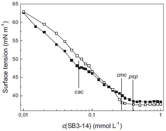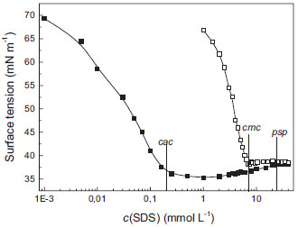 RESULTS AND DISCUSSION Surface tension measurements Figure 1 shows the variation in the surface tension as a function of the SDS concentration (c(SDS)) in deionized water, for solutions of pure SDS and SDS-PEI. The plotting of data obtained for pure SDS shows a discontinuity at 38.2 mN m-1 with a cmc value of 7.0 mmol L-1, which is consistent with reports in the literature.14,27 However, a high surface-activity was observed for the SDS-PEI system, because the surface tension decreased sharply at lower surfactant concentrations in comparison with the system without PEI. A plateau occurred at 35.9 mN m-1, this being attributed to the cac at 0.17 mmol L-1, and this behavior is consistent with a densely packed interface.27 Further addition of surfactant leads to lower surface tension values compared with those observed for pure SDS. In addition, when the cmc value is reached the surface tension of the SDS-PEI system increases, reaching values that are similar to the micellar SDS. This occurs because of the possible migration of some surfactant ions, initially connected to the PEI chain at the air-liquid interface, into the solution during the micellization process.27 When the surface tension reaches values similar to those obtained for pure SDS solutions, above the cmc, the polymer is saturated and the psp occurs at 37.9 mN m-1 for c(SDS) = 24.9 mmol L-1.