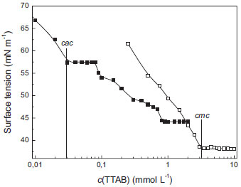 ![]() Figure 2. Surface tension with increasing concentrations of TTAB; (□) pure TTAB and (■) TTAB-PEI (c(polymer) = 2.0 mg mL-1) at 25.0 ± 0.1 ºC