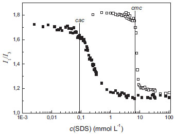 Fluorescence measurements The steady-state fluorescence technique was used, with pyrene as a fluorescent emission probe, to confirm the formation of polymer-surfactant complexes. The fluorescence emission spectrum for pyrene has five vibronic bands and the ratio between the intensities of the first (I1) band at 372.8 nm and the third (I3) band at 384.0 nm is highly sensitive to small changes in the microenvironment of the medium.35,36 For instance, the I1/I3 value for hexane is equal to 0.6 while a value of 1.8 is reported for water.37 This type of probe is widely used in the study of micelles26,38 and lipophilic environments,39,40 as well as in the investigation of aqueous mixtures of polyelectrolytes and surfactants.17,18 A micellization process can be followed by the decrease in the I1/I3 ratio due to the migration of pyrene from aqueous solution to the micellar core microenvironment.24,25 Figure 4 shows plots of the I1/I3 ratio for pyrene in aqueous solution as a function of c(SDS) for solutions of SDS and SDS-PEI. The cmc value was determined to the surfactant concentration at which the upper plateau ends, this being 7.0 mmol L-1.17 The addition of PEI to the system causes a significant change due to the SDS-PEI association. The results indicated that the onset of association (cac) occurred at 0.09 mmol L-1. At low surfactant concentration the I1/I3 ratio is similar the water polarity (~1.80),36 while for high concentrations of SDS, above the cmc and cac, the I1/I3 ratio decreased to around 1.15, which is consistent with values reported for SDS micelles.41