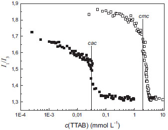 Figure 5 shows the influence of TTAB on the I1/I3 values for pyrene in water for solutions of TTAB and TTAB-PEI. For solutions of pure surfactant a classical behavior was observed, with a well-defined cmc of 1.75 mmol L-1, lower than the value obtained through surface tension measurements (3.30 mmol L-1). In general, the cmc values obtained using the fluorescence technique are slightly lower than the values determined by other methods. This difference is attributable to the fact that pyrene, because of its low solubility in water, induces the formation of pre-micellar aggregates.14 Above the cmc, the I1/I3 ratio decreased reaching 1.31, which is attributed to the presence of surfactant micelles.36,42 In the presence of PEI the profile changes and shows the cac at c(TTAB) of 0.03 mmol L-1.