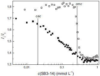 The influence of the addition of SB3-14 on the I1/I3 values of the aqueous solutions of pyrene for solutions of SB3-14 and SB3-14-PEI is shown in Figure 6. The cmc value of 0.25 mmol L-1 was obtained for SB3-14. For SB3-14-PEI solutions the I1/I3 ratio begins to decrease at ca. 0.02 mmol L-1, determining the cac, but the value for the ratio gradually decreases, stabilizing at I1/I3= 1.32 with the addition of SB3-14 at a concentration above 0.40 mmol L-1. This behavior is attributed to a less cooperative association,42,43 compared with other systems.14