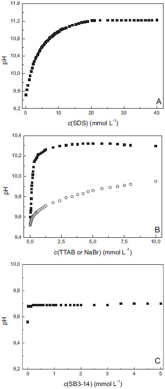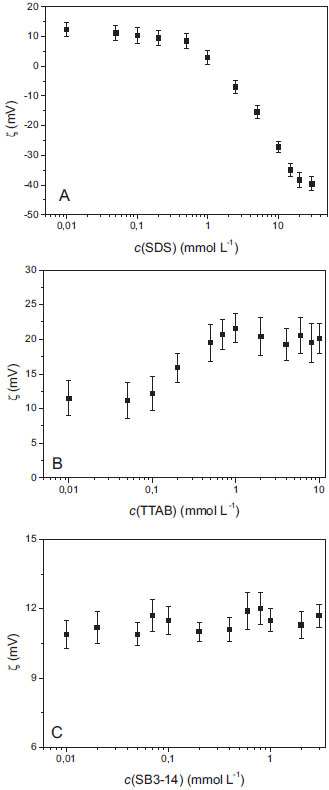 Figure 7B shows the influence of the addition of TTAB on the pH of the aqueous solutions of PEI, a large increase in the pH values being observed with an increase in the surfactant concentration: with the addition of TTAB at a concentration as low as 1.25 mmol L-1 the pH increases from 9.5 to 10.30 and above this concentration the pH remains practically constant. The data suggest that the Br- counter-ion influences the pH of the solution and therefore a similar study was carried out adding NaBr to an aqueous solution of PEI. For comparison, experimental data are also shown in Figure 7B, where it can be observed that there was an increase in the pH value with increasing c(NaBr), but the pH value reaches 9.95 at c(NaBr) = 10.0 mmol L-1, while for the same TTAB concentration the pH value reaches 10.30. These differences suggest that Br- is able to interact with both the positively charged polymer and the head of the surfactant, forming double layer coordination complexes,44,45 which leads to a more accentuated increase in the pH value than that observed for the system with only NaBr. The formation of these complexes can explain the films observed when this system was studied by way of surface tension measurements (see above). For the system comprised of PEI and SB3-14, no significant changes in the pH values occurred (Figure 7C). In this case, the zwitterionic surfactant was not able to bind specifically with the positively charged sites on the polymeric chains, and thus did not displace the acid-base equilibrium. The interaction of SB3-14 with PEI occurs through hydrophobic effect. Zeta potential of the surfactant-PEI aqueous solutions The ζ data are related to the surface charge density of the complexes. The PEI solution (c(PEI) = 2.0 mg mL-1) had a positive ζ value (+15.1 ± 2.0 mV) due to the positive charges of the protonated amino groups. On the other hand, a negative ζ value from -49.8 ± 5.1 mV was obtained for pure SDS aqueous solutions, in a concentration above the cmc. As expected, the addition of SDS to the PEI solutions led to achange in the ζ value from positive to negative (Figure 8A). This behavior should be explained considering the SDS-PEI interactions. Below cac concentration, the specific interaction between SDS and PEI leads to very small changes in ζ values and it remains positive. Above the cac, due to the SDS-PEI complex formation, the ζ value gradually decreases until concentrations near to psp, because of the global charge changes in the SDS-PEI complex. In the TTAB case (Figure 8B), there is no ζ charge inversion and the changes in ζ values are very small compared to SDS-PEI system. These observations are in agreement with surface tension data (Figure 2). Near to cac, the ζ value starts to increase due the TTAB-PEI complex formation, but it stops to increase at ~0.9 mmol L-1, which is the concentration observed for the formation of mesostructured thin films at the air‑liquid interface in surface tension measurements. At this point, the ζ values of TTAB-PEI solutions (+20.1 ± 2.2 mV) are very small if compared to the pure TTAB solutions (+51.1 ± 4.3 mV), because in this technique the ζ potential is measured only from the species in solution. The increase in the zwitterionic concentration in presence of PEI had practically no change on the ζ values (Figure 8C), which is in agreement with the results obtained through the other experimental techniques used.