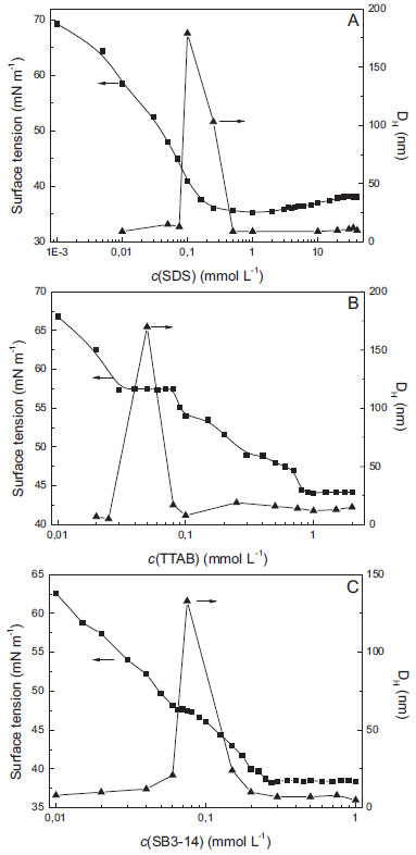 DLS data for PEI and surfactants in aqueous solution The PEI-surfactant systems were studied by way of DLS measurements, in order to understand the influence of the surfactant on the conformation of the polymeric chains in solution through analysis of the hydrodynamic diameter (DH) of the aggregates. Figure 9 shows the DH values for SDS-PEI (A), TTAB-PEI (B), and SB3-14-PEI (C), along with the corresponding surface tension profiles for comparison. Figure 9A indicates that when the c(SDS) was close to the cac (determined by way of the surface tension) a considerable increase in the DH occurred, indicating an association between SDS and PEI, which promotes a conformational change in the polymer chain. The specific binding of SDS molecules to the PEI chain increases the exclusion volume of the polymer in solution and, consequently, its DH value. Since the polymer charges are neutralized, the hydrophobic effect starts to control the interlacing, leading to the relaxation of the polymer chains and more folding conformations, as described by Wang et al..13 The DH value decreased with the further addition of SDS to the solution, probably due to the minimization of the inter chain repulsion (double electric layer contraction) promoted by an increase in the ionic strength (self-salt effect). The TTAB-PEI system (Figure 9B) shows that at low surfactant concentrations (<0.02 mmol L-1) the behavior was very similar to that observed for the SDS system: at the cac, the DH value increased due to the beginning of the TTAB-PEI interaction. Above the cac, the DH value decreased with the further addition of surfactant, due to the folding of the polymeric chains. Figure 9C shows the data for the SB3-14-PEI system. Its behavior at close to the cac value determined by way of the surface tension was very similar to that of the SDS-PEI system, the observed increase in DH providing evidence for the beginning of the formation of SB3-14-PEI aggregates. In the same way, the addition of more surfactant leads to a folding of the polymeric chains.