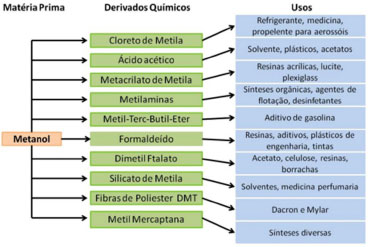 Devido à suas baixas emissões de CO2 (associado ao processo de produção) e taxa de octanagem, o biometanol já é considerado melhor combustível para certos tipos de motores de combustão interna que gasolina.34 Uma máquina movida a biometanol pode operar a uma razão de compressão maior e ser facilmente resfriada. Porém, o biometanol apresenta algumas desvantagens: (a) menor pressão de vapor que a gasolina, o que deixa os motores mais lentos para partirem frias, e (b) queima com uma chama invisível, o que representa um risco, uma vez que é mais difícil para trabalhadores de emergência detectarem um acidente.34 Para resolver estes problemas, o biometanol hoje é misturado com 15% de gasolina para fazer o biocombustível conhecido como (M85).28 Esse álcool também é amplamente utilizado no processo de transesterificação de triglicerídeos, para produção do biodiesel.26,27 A reação de transesterificação utilizada para produção do biodiesel utiliza como coadjuvante um álcool que pode ser o biometanol ou o bioetanol. Quimicamente, a diferença no biocombustível é quase nula. Apesar de muitas pesquisas com biodiesel etílico já terem sido realizadas em diversas partes do mundo, todos os países que utilizam o biodiesel o fazem via metílica. Isso ocorre, pois, nesses países a disponibilidade do bioetanol da biomassa é bastante reduzida. Assim, entre bioetanol e biometanol, evidentemente, escolhe-se o mais barato e o mais reativo (biometanol). Entretanto, pela nossa imensidão territorial, o cenário brasileiro é atípico. É fato bastante reconhecido, a importância do bioetanol no mercado energético brasileiro. O biometanol apresenta as seguintes vantagens frente ao bioetanol no processo de produção do biodiesel, são elas:35 (a) o consumo de biometanol no processo de transesterificação é cerca de 45% menor que do bioetanol; (b) o preço do biometanol é quase a metade do preço do bioetanol; (c) é mais reativo; (d) para uma mesma taxa de conversão (e mesmas condições operacionais), o tempo de reação utilizando o biometanol é menos da metade do tempo quando se emprega o bioetanol; (e) considerando a mesma produção de biodiesel, o consumo de vapor na rota metílica é cerca de 20% do consumo na rota etílica, e o consumo de eletricidade é menos da metade; (f) os equipamentos de processo da planta com rota metílica é cerca de um quarto do volume dos equipamentos para a rota etílica, para uma mesma produtividade e mesma qualidade. Apesar das vantagens do biometanol frente ao bioetanol, esse álcool apresenta algumas desvantagens (a) ser tóxico; (b) ocorrencia maior de incêndios (mais volátil); (c) transporte é controlado pela Polícia Federal, por se tratar de matéria-prima para extração de drogas; e (d) apesar ser ociosa, a capacidade atual de produção do biometanol brasileira só garantiria o estágio inicial de um programa de âmbito nacional. O biometanol é também um importante solvente industrial, utilizado em larga escala na indústria de plásticos, na extração de produtos animais e vegetais, e como solvente em reações de importância farmacológica, sínteses orgânicas de diversos intermediários químicos (Figura 1).11,12,16,26,27 É considerado uma importante fonte de energia alternativa por estocar e transportar energia do hidrogênio, que, por sua vez, pode ser derivado de fontes de energia renováveis, como energia solar, hidrelétrica etc.36