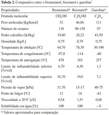BIOMETANOL: PRODUÇÃO, CARACTERIZAÇÃO E USOS Apesar da gaseificação de biomassa possibilitar a produção de energia térmica e diversos produtos bioquímicos, optou-se pelo biometanol como produto final, pois é um dos compostos químicos mais usados atualmente, com utilização em diversos setores como transporte, indústria e energia.11,12,16,26,27 O biometanol ou metanol renovável é um liquido incolor, volátil, inflamável, tóxico e apresenta odor alcoólico levemente adocicado, sendo mais simples dos álcoois, possuindo apenas um átomo de carbono em sua estrutura molecular. Sua reatividade é determinada pelo grupo funcional hidróxi, sendo, portanto, completamente solúvel em água, álcoois, ésteres e na maior parte dos solventes orgânicos, além de possuir uma razoável solubilidade em óleos e gorduras.26,28,29 O biometanol é talvez a mais antiga forma de produção de metanol. Foi inicialmente produzido a partir de madeira; daí o nome por que ficou conhecido: "álcool da madeira", o biometanol foi descoberto pelos egípcios para o processo de embalsamento por meio da pirólise destrutiva de madeiras e evoluiu desde então para ser uma das matérias-primas mais consumidas na indústria química.30 A importância da economia do biometanol é evidenciada nos trabalhos do vencedor do prêmio Nobel de Química de 1994, George Andrew Olah, onde ele ressalta a importância do biometanol como biocombustível e armazenamento de energia com grandes perspectivas futuras na substituição de combustíveis fósseis.12 De acordo com The Methanol Industry (2014), é estimada a produção de 100 milhões de metros cúbicos de biometanol no mundo, e que, por dia, 100 mil toneladas de biometanol sejam usados como matéria-prima em processos químicos ou como biocombustíveis.31 Ainda segundo o mesmo autor, houve uma demanda de 65 milhões de metros cúbicos de metanol no ano de 2013.31 A economia gerada pelo biometanol é muito grande não só pela versatilidade da substancia química, que é usada como matéria-prima para diversos produtos químicos, mas também pela matéria-prima que pode ser usada para sua síntese (carvão, gás natural, biomassa, resíduos e CO2).32 As propriedades do biometanol produzido via gaseificação de biomassa não diferem, em composição química, do metanol produzido com matéria-prima não renovável como petróleo, carvão e gás natural.29 As diferenças entre os compostos estão nos seus processos de fabricação e no impacto que estes processos provocam, dado que o biometanol é feito com matéria-prima renovável, diminuindo a emissão de carbono na atmosfera e gases que potencializam o efeito estufa.12,29 A matéria-prima, além de renovável para o caso do biometanol, ainda pode vir de diversas fontes. A biomassa utilizada pode ser um cultivo específico para o processo, como o caso de florestas energéticas, resíduos agrícolas, resíduos florestais, resíduos orgânicos urbanos e até plásticos.29,32 A grande desvantagem atual é o maior custo de produção do biometanol, que pode chegar de 1,5 até 4 vezes o valor do metanol de gás natural devido à diferença de tratamento da matéria-prima e de alguns processos na produção.29,32 Apesar de atualmente apresentar custo de produção maior, há estimativas para que em um futuro próximo, com a escassez de recursos não renováveis, haja uma vantagem competitiva na produção de biometanol como biocombustível.12,33 Na Tabela 2 estão apresentadas as principais propriedades físicas do biometanol em comparação com outros combustíveis. Conforme pode ser observado, o rendimento do biometanol como combustível, em alguns aspectos, evidencia-se melhor que o da gasolina, tais como: maior número de octanos (maior resistência à ignição espontânea em motores de alta compressão) e maior ponto de fulgor (maior segurança para manuseio, pois libera vapor em quantidades inflamáveis a uma temperatura maior que a gasolina).
