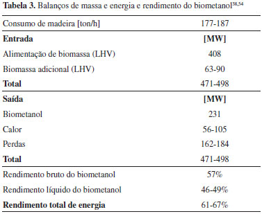 ASPECTOS ECONÔMICOS DO BIOMETANOL A maioria das plantas de produção de metanol ainda usam o gás natural ou carvão como matéria-prima, sendo que a mudança do combustível exige uma mudança em partes do processo, o que inviabiliza uma troca imediata de matéria-prima em indústrias ativas. No entanto, estudos recentes apontam vantagens econômicas no uso da gaseificação da biomassa lignocelulósica para geração de produtos com maiores valores agregados e co-geração de energia.51-53 Como os parâmetros do processo de gaseificação e síntese de combustíveis via reações de Fischer-Tropsch podem variar muito, é difícil fazer uma análise econômica precisa, tanto do investimento inicial quanto do valor final do produto sem antes estabelecer inteiramente o processo e parâmetros desejados. A biomassa lignocelulósica é um dos principais fatores que varia o valor do produto final, dependendo do pré-tratamento que deverá ser feito, transporte e do seu custo de compra.51-53 Por exemplo, o uso de resíduos do setor florestal (resíduos de colheita e resíduos do processamento de madeira) pode reduzir o custo de aquisição da matéria-prima para gaseificação e, consequentemente, diminuir o custo de produção do biometanol. Muitas variáveis também influenciam o custo de instalação do processo, sendo que o primeiro passo é escolher um modelo de processo (tipo de gaseificação, limpeza de gás, síntese do biometanol e volume de produção). Modelos de reatores mudam conforme o processo escolhido, conforme o volume desejado de biomassa a gaseificar e até a temperatura usada no processo.51-53 Uma vantagem do processo de síntese do biometanol aqui descrito (LPMEOHTM) é o baixo custo por galão do biometanol produzido, sendo que o custo de produção em fase líquida chega a ser entre US$ 0,02 a 0,07 mais barato que em fase gasosa.17 Outro fator que é determinante para os preços finais de biometanol é a destilação. O biometanol tem, basicamente, três principais graus de pureza dependendo do uso: (1) grau químico; (2) grau de combustível; e (3) grau MTBE (Metil Terc-Butil Eter). Para o grau químico é necessária uma maior pureza, com menos de 0,1% em massa de água. Já para o grau de MTBE e combustível, 1% em massa de água é aceitável para ambos.17 Hamelinck et al. estimam que um sistema de 400MWth, com biomassa disponível a US$ 2/GJ, pode produzir biometanol a US$ 9-12/GJ, valor pouco mais alto que a produção atual por gás natural. De acordo com o mesmo autor, a aplicação em larga escala (2000MWth) abaixa os custos de investimento e, aliados a uma biomassa disponível a US$ 1,7/GJ, o preço do biometanol produzido (US$ 6,1-7,4/GJ) abaixa mais que o preço atual (US$ 10/GJ).16 Esta biomassa disponível a baixos preços é uma realidade de países como o Brasil, com alta disponibilidade de biomassa e resíduos de biomassa a um baixo preço.16 Renó et al. mostram que para uma planta de produção de biometanol com capacidade térmica de 400 MWth, o total de biomassa consumida está em torno de 153.000 kg/h mais um adicional entre 23.625 kg/h ou 33.750 kg/h, dependendo de como é feito a combinação entre as unidades de produção de calor e potência. Seguindo este estudo, o total de biomassa consumida varia entre 177-187 ton/h.38,54 Os resultados dos estudos citados do balanço de energia e produção do biometanol estão listados na Tabela 3.38,54