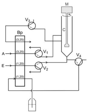 ![]() Figura 2. Diagrama do módulo para ELL em linha de etanol em biodiesel. A: amostra, E: extrator (água), Vi=válvulas solenoide de três vias, M= mini-motor CC (12 V), Bp=bomba peristáltica, C= câmara de extraçao. Números entre parênteses indicam vazoes em mL min-1