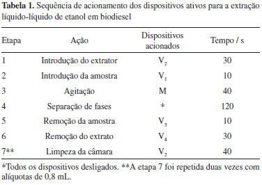 Reagentes, soluções e amostras Todos os reagentes utilizados foram de grau analítico e as soluções foram preparadas com água deionizada (resistividade > 18 MΩ cm). Solução de dicromato de potássio 0,03 mol L-1 foi preparada a partir da dissolução de 0,8820 g do reagente (Synth) em água, seguido pela adição de 22,0 mL de ácido sulfúrico (Merck), sendo o volume final ajustado para 100,0 mL com água. Soluções de etanol entre 0,05 e 0,50% (v/v) foram preparadas em biodiesel a partir de etanol anidro (Merck, 99,9%). As amostras de biodiesel empregadas nesse trabalho foram sintetizadas pelo próprio grupo de pesquisa empregando óleo de soja e etanol em meio alcalino.8 O excesso de etanol foi removido por sucessivas lavagens com água. Diagrama de fluxos e procedimento O módulo de análises (diagrama na Figura 2) foi operado de acordo com a rotina descrita na Tabela 1 para a extração de etanol em biodiesel. Alíquotas de 540 µL de amostra e 600 µL de água foram sequencialmente bombeadas para câmara de extração através das válvulas V1 e V2, respectivamente (etapas 1 e 2). O extrator foi introduzido antes da amostra para evitar a contaminação do canal C (Figura 1) pelo biodiesel. Após a agitação promovida pela haste de Teflon® (etapa 3), a mistura era mantida em repouso por 120 s (etapa 4). Em seguida, a fase orgânica residual era aspirada para o descarte pelo acionamento da válvula V3 (etapa 5). As etapas 2-5 eram repetidas pelo número programado de extrações e, posteriormente, o extrato aquoso era coletado através da válvula V4 (etapa 6). O volume deste extrato (500 µL) era menor que o volume de extrator introduzido, pois uma parte da fase aquosa era removida juntamente com a fase orgânica para evitar contaminação do extrato aquoso. Ao extrato coletado eram adicionados 500 µL de solução de dicromato de potássio 0,03 mol L-1 em meio ácido. Os sinais de absorvância do produto da reação entre o etanol e o dicromato ([Cr(H2O)6]3+) foram medidos em 590 nm após 10 min.9,10 A câmara foi lavada com 1,6 mL de água (0,8 mL por vez) entre as extrações (etapa 7).