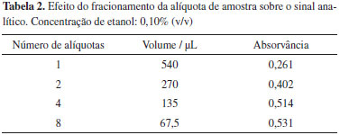 Duas estratégias foram exploradas para a avaliação da eficiência de extração, com a adição de diferentes alíquotas de amostra à mesma alíquota de extrator. No primeiro experimento, visando avaliar o efeito do número de extrações (N), volumes fixos de amostra (540 µL) foram adicionados a 600 µL de extrator, sendo o processo de extração e separação de fases executado após cada adição. Foi observada uma relação linear entre a absorvância medida (A) e o número de extrações (até 20 extrações), descrito pela equação A = 0,0056 + 0,0097 N, r = 0,999. Desta forma, a sucessiva adição de alíquotas de amostra resulta na pré-concentração do analito no extrato e a relação linear indica que o número de extrações pode ser ajustado à concentração do analito na amostra, num compromisso entre sensibilidade e frequência de amostragem. Devido à tendência assintótica observada após 20 extrações (aumento de sinal < 10% em 10 extrações), após este limiar, o aumento do número de extrações não compensa o prejuízo à frequência de amostragem. Em outro experimento, o volume de amostra inserido na câmara de extração (540 µL) foi dividido em 2, 4 ou 8 porções, sendo observado aumento da eficiência de extração com a diminuição do volume de amostra (Tabela 2), o que está de acordo com o esperado em processos de ELL. A variação pouco significativa do sinal analítico para volumes de amostra de 67,5 e 135 µL (3,3%) é um indicativo da tendência à extração quantitativa. Entretanto, isto não é essencialmente necessário, pois o dispositivo proposto permite extrações reprodutíveis devido ao rigoroso controle de tempo, volumes e condições de mistura.