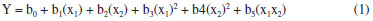 Na qual b0 é o valor da média dos pontos centrais e b1 até b5 são os coeficientes do modelo a serem determinados. Os coeficientes da equação do modelo foram obtidos por meio da Equação 2: