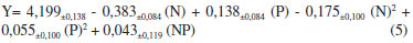 Na qual X é a matriz de contraste, Xt é a transposta de X e MQep é média quadrática do erro puro. A Equação 5 apresenta o modelo matemático desenvolvido para otimização das variáveis N e P, acompanhado pelos seus desvios absolutos.