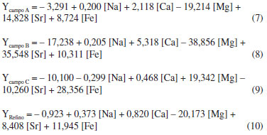 Para finalizar a classificação das amostras foi aplicada a LDA, obtendo funções matemáticas por meio de combinações lineares que minimizam as variações dentre um mesmo grupo de amostras e maximizam as diferenças entre os grupos diferentes, identificando o grupo que cada amostra pertence.34 Dentre as técnicas de análise exploratória aplicadas, a LDA é a única metodologia supervisionada, viabilizando a utilização industrial, pois o modelo não precisa ser recalculado quando são inseridas amostras desconhecidas a serem classificadas. As equações 7, 8, 9 e 10 são funções discriminantes geradas para os campos A, B, C e para o refino R, respectivamente.