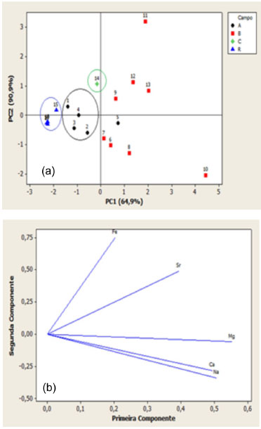 Foi obtido um número relativamente alto de experimentos (54) e em cada qual foram analisados os teores de 5 metais (Na, Ca, Mg, Sr e Fe), gerando uma matriz grande o suficiente para dificultar a extração de informações relevantes. Desta forma, o emprego de técnicas exploratórias reduz a dimensão do conjunto de dados das variáveis originais (metais), resultando numa melhor visualização das respostas obtidas pelo ICP OES. Além disso, a PCA aplicada às triplicatas confirmou a similaridade das leituras, pois os pontos amostrais se sobrepuseram, comprovando a eficiência da técnica ICP OES na precisão da determinação desses metais, obtendo desvios relativos para todas as medidas menores que 3%. Como as triplicatas demonstraram muita semelhança, decidiu-se efetuar todas as análises quimiométricas com as médias das três análises. A Figura 3 apresenta os gráficos de loadings e escores, discriminando as amostras em quatro grupos.