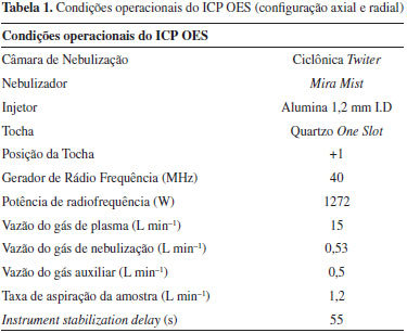 Todas as medidas foram feitas em triplicatas e as áreas dos picos de intensidade foram integradas nos respectivos comprimentos de onda de cada elemento. Os parâmetros utilizados para execução das análises estão listados na Tabela 1.