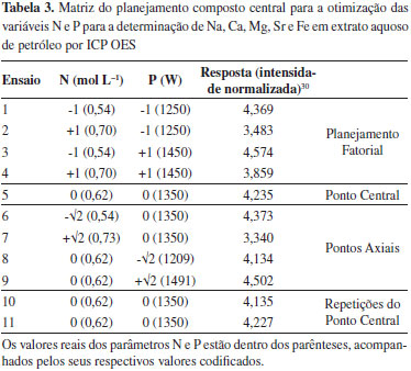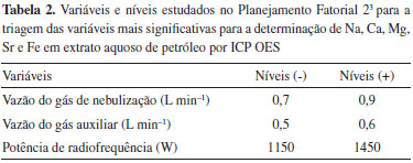 Entretanto, a carga orgânica migrada para fase aquosa, devido ao próprio petróleo e aos solventes orgânicos usados para extração, interfere na estabilidade do plasma e na sensibilidade do equipamento. Desta forma, devem-se empregar ferramentas estatísticas para alcançar as melhores condições operacionais, obtendo o máximo de informação do sistema em estudo com um número mínimo de experimentos realizados.20-24