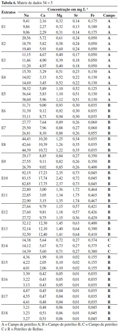 Sendo assim, após a definição das condições ótimas de operação do ICP OES para a determinação dos metais, foi obtida uma matriz de dados 54 × 5 com o resultado das concentrações dos metais. A Tabela 6 apresenta a matriz de dados construída a partir da concentração dos metais nos extratos aquosos de petróleo, analisadas em triplicatas.