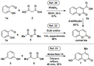 ![]() Esquema 1. Sínteses de cumarinas descritas em manuais de laboratório com rendimentos típicos obtidos por estudantes