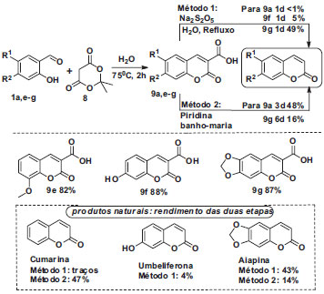 Para as sínteses das cumarinas aqui apresentadas, selecionamos o procedimento que emprega água como solvente e tem como reagentes o ácido de Meldrum 8 e o saliciladeído 1a, que leva à formação do ácido cumarino-3-carboxílico 9a por meio de uma reação de condensação de Knoevenagel, Esquema 2.23,24 Para tentar diminuir o tempo de reação e inserir o uso de reação orgânica assistida por micro-ondas, a síntese de 9a foi avaliada empregando um reator dedicado. Quantidades equimolares do aldeído 1a e do ácido de Meldrum 8 foram aquecidos em água pelo tempo indicado a 80 ºC (2 min), 100 ºC (2 min) e 140 ºC (10 min) até consumo total de 8, resultando em rendimentos de 10%, 30% e 64% de 9a, respectivamente. Apesar de diminuir o tempo para o consumo de 8, o rendimento não foi maior que o obtido pelo método que emprega aquecimento convencional (97%).