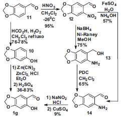 O sesamol 10, apesar de ser comercialmente disponível, foi obtido em escala multigrama pela reação de Dakin do piperonal 11 com H2O2 e ácido fórmico, Esquema 5.40 A formilação de Gatterman do sesamol para preparar o 6-hidróxi-piperonal 1g requer assistência direta do professor, pois esta reação é perigosa, uma vez que gera HCN in situ durante 2 horas. Entretanto, esta reação de formilação foi realizada várias vezes por estudante experiente, sempre em capela típica de laboratório de ensino com boa ventilação, e várias medidas práticas foram adotadas para a obtenção de 1g em rendimento satisfatório e com segurança (ver experimental). Sem estes cuidados houve várias tentativas sem sucesso. Para contornar o emprego da reação de Gatterman elaboramos a rota descrita no Esquema 5, que emprega piperonal como reagente de partida e reações comuns em cursos experimentais de química orgânica. Assim, o 6-nitro-piperonal 12 foi obtido a partir da nitração do aldeído 11.41 Redução com NaBH4 na presença de níquel de Raney forneceu o amino-álcool 13, cuja oxidação seletiva do álcool forneceu o amino-aldeído 14 em 46% global a partir do piperonal.42 Alternativamente, e de forma preferencial, foi possível preparar 14 em 54% de rendimento global a partir de 11, com uma etapa reacional a menos e sem o emprego do reagente de cromo (PDC) e do níquel de Raney, por meio da redução seletiva do grupo nitro de 12 empregando-se uma mistura de NH4OH e FeSO4.43 Apesar disso, a purificação do produto foi mais trabalhosa. Para a síntese do fenol 1g via amina 14 foram avaliadas diversas tentativas de diazotação, sem sucesso. A única condição que forneceu o 6-hidróxi-piperonal 1g foi a decomposição do sal de diazônio realizada em solução saturada de CuSO4,44 porém o baixo rendimento desta reação reduziu o rendimento global a 4%, muito inferior à rota via reação de Gatterman, que fornece 1g entre 27-64% de rendimento total, Esquema 5.