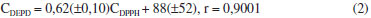 CONCLUSÕES O método proposto mostrou-se viável para determinação espectrofotométrica da capacidade antioxidante em amostras de vinhos (tinto e branco), chás e infusões empregando o radical cátion DEPD+ em função de resultados concordantes com métodos descritos na literatura. O Fe(III) foi o oxidante mais efetivo para geração do DEPD+ na proporção 1:10 (oxidante/amina). Os estudos realizados indicaram que a amina resiste à oxidação pelo oxigênio atmosférico em meio ácido, sendo inviável seu emprego em meio básico ou para valores de pH superiores a 6. O método foi otimizado empregando como parâmetro a capacidade de consumo do radical e, por consequência, redução do sinal relativo ao mesmo empregando quatro substâncias (ácido ascórbico, ácido gálico, ácido tânico e quercetina) frente a diferentes parâmetros. Após otimização das variáveis físicas e químicas foi observado menor EC50 para os compostos avaliados AT, AG, quercetina e ácido ascórbico, nesta ordem. Contudo, a presença de solventes orgânicos em concentrações superiores a 10% (v/v) no meio reacional levou à redução da sensibilidade do método proposto. Quanto a parâmetros como estabilidade do radical e sensibilidade em comparação com o método empregando a amina DMPD o método proposto apresentou melhor resultados. Por fim, a partir da comparação dos resultados obtidos para diferentes amostras por análise de correlação (r = 0,9970, para um intervalo de 95% de confiança), o método com o radical cátion DEPD+ foi mais concordante com o ABTS em função do valor do coeficiente angular de 0,75(±0,02).