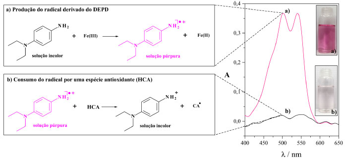Figura 1. Etapas envolvidas na formação e consumo do radical cátion derivado do DEPD e perfil espectral na região do visível antes e após reação com composto antioxidante. a) Produção do radical evidenciando duas bandas de máxima absorção em 500 e 540 nm, respectivamente e b) Reação do radical gerado DEPD+ frente a um antioxidante (HCA), sendo empregado solução de ácido ascórbico 10 mg L-1 na avaliação espectral. Na parte interna do espectro são apresentadas duas fotografias correspondentes a solução do radical antes (a) e após adição (b) de ácido ascórbico, respectivamente