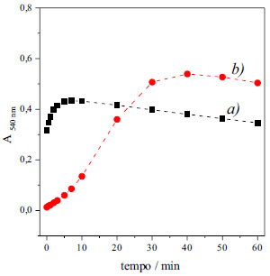 ![]() Figura 2. Perfil de geração do radical cátion DEPD+ monitorado a 540 nm em função do oxidante. a) Fe(III) e b) K2S2O8, ambos oxidantes foram avaliados a concentração de 0,2 mmol L-1 e DEPD a 2 mmol L-1.