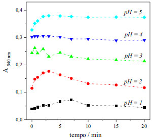 ![]() Figura 3. Avaliação da influência do pH na geração do radical DEPD+em função do tempo