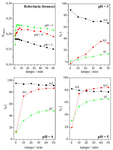![]() Figura 4. Influência do pH na geração (referência) e consumo (%I) do radical cátion DEPD+. O consumo do radical foi monitorado frente ao ácido ascórbico (AA, 5 mg L-1 ou 28,4 µmol L-1), ácido gálico (AG, 1 mg L-1ou 5,88 µmol L-1) e ácido tânico (AT, 4 mg L-1 ou 2,35 µmol L-1)
