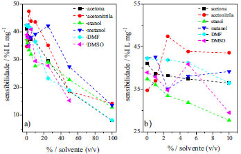 ![]() Figura 5. a) Variação da sensibilidade do método em função da concentração percentual (v/v) dos solventes orgânicos avaliados empregando ácido gálico e b) expansão do gráfico destacando a avaliação de 0 a 10% (v/v) dos solventes orgânicos avaliados