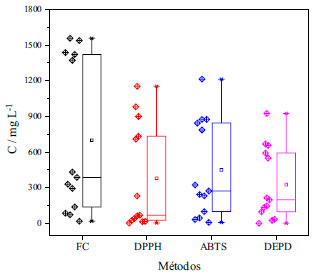 ![]() Figura 6. Gráfico do tipo boxplot (diagrama de caixa) referente aos resultados para as amostras analisadas em relação a cada método empregado. Limite inferior do retângulo corresponde a 25 e o superior a 75% dos resultados para cada método. O ponto central indica o valor médio, enquanto a linha no interior do retângulo a mediana dos resultados