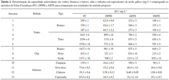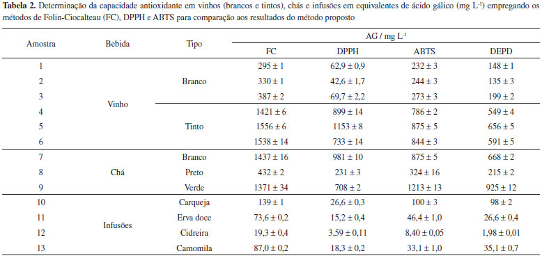 De acordo com os resultados observados (Tabela 1) percebeu-se que o AT apresentou a maior eficiência quanto à inibição do radical DEPD+ em função do menor valor de EC50, seguido do AG, QC e por fim o AA. As faixas lineares obtidas, precisão e linearidade indicam que o método é viável para ser empregado na avaliação da capacidade antioxidante em diferentes amostras de alimentos e bebidas. Em uma avaliação comparativa, empregando-se as condições experimentais descritas no trabalho de Fogliano e colaboradores9 e os parâmetros otimizados neste trabalho (para DEPD), foram construídas curvas analíticas para a amina DMPD usando AG como padrão. Neste estudo se obteve as seguintes relações: %I = 16CAG + 2,8 (r = 0,9987) e %I = 22CAG + 3,2 (r = 0,9979), respectivamente. O método empregando o DEPD apresentou maior sensibilidade (Tabela 1), o que justifica o emprego desta amina na determinação da capacidade antioxidante, além da maior estabilidade do DEPD em relação ao DMPD, como já mencionado em estudos anteriores neste trabalho. Análise das amostras Para a aplicação do método proposto foram selecionadas amostras de vinho (tinto e branco), chá e infusão, estas foram utilizadas por apresentarem, em sua composição, compostos com reconhecida ação antioxidante. Essas amostras foram analisadas pelo método proposto e pelos métodos Folin-Ciocalteau (FC), DPPH e ABTS. Os resultados são apresentados na Tabela 2.
