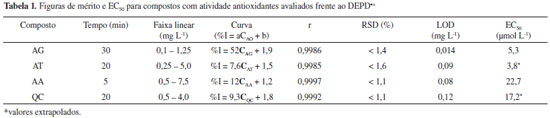 Considerando que o solvente orgânico foi adicionado ao meio reacional juntamente com o padrão, pode-se explicar esses resultados a partir da redução da polaridade e da hidrofobicidade do meio que contém o ácido gálico e o radical DEPD+. O radical tem natureza majoritariamente hidrofílica, mas também se deve levar em consideração sua natureza orgânica, assim, ele pode apresentar interações fortes com moléculas de água, mas também com algumas moléculas orgânicas, desde que estas sejam preferencialmente polares. Se o solvente orgânico consegue solvatar o ácido gálico e o radical DEPD+ de forma mais eficiente do que a água, devido à natureza orgânica dessas espécies, pode-se ter uma esfera de solvatação que aumenta em função da concentração do solvente no meio e consequente diminuição da quantidade de água. Assim, a aproximação entre esse antioxidante e o radical fica dificultada, o que acaba comprometendo a reação entre estas espécies, reduzindo o consumo do radical e, consequentemente, a sensibilidade do método. Outro fator que deve ser levado em consideração é a estabilização do radical gerado no solvente orgânico, tornando-o menos reativo. O processo de estabilização ocorreria por meio das interações existentes no processo de solvatação. Exemplo disso são as espécies denominadas radicais de Wurster, as quais são derivadas de compostos estruturalmente semelhantes ao DEPD, e que são estabilizadas em solventes orgânicos como tolueno, benzeno e clorofórmio.24 Assim, é possível que os dois fatores apresentados ocorram de forma conjunta levando à diminuição da sensibilidade do método, consistindo em uma limitação do mesmo. A partir dos resultados apresentados nota-se que existem restrições quanto à sensibilidade deste método, a depender do tipo e da concentração do solvente orgânico no qual os compostos ou amostra estejam solubilizados. Assim, a depender do solvente (e sua respectiva concentração) o método pode ser implementado, contudo, a concentração do(s) analito(s) a ser quantificada é um fator a ser considerado em função de uma possível redução na sensibilidade, visto que para concentrações até 10% (v/v) dos solventes avaliados a redução da sensibilidade foi menos pronunciada, quando comparada com maiores concentrações. Em alguns casos, ocorreu aumento da sensibilidade neste intervalo. No entanto, deve-se levar em consideração que tal comportamento pode não ser válido para antioxidantes lipofílicos, uma vez que na avaliação realizada empregou-se apenas o AG, o qual é hidrofílico. A escolha pelo AG se deu em virtude deste composto e derivados (além de compostos semelhantes) estarem em maior concentração em amostras de alimentos como vinhos, chás e infusões. Adicionalmente, o radical derivado do DMPD mostrou-se instável em solventes como metanol e etanol,9 o que não foi observado para o DEPD, possivelmente em função do aumento da cadeia alquílica ligada ao nitrogênio. Figuras de mérito do método proposto Os compostos antioxidantes empregados para otimização do método apresentaram cinéticas de reação diferenciadas. Foi observado que o consumo do radical (redução do sinal analítico) pelo ácido ascórbico era rápido quando comparado com os outros compostos, ocorrendo quase que imediatamente após a adição do redutor ao meio reacional. Dessa forma, o AA foi excluído dessa etapa de otimização tendo seu tempo mínimo de reação estabelecido em 5 min. A quercetina (QC), um dos flavonóides presentes na dieta humana mais investigados por suas propriedades antioxidantes e terapêuticas, foi incluída nesta etapa devido ao seu caráter mais lipofílico,7 uma vez que compostos com tal natureza encontram-se presentes em muitas bebidas nas quais este método pode ser empregado. Para estabelecer qual seria o tempo mínimo necessário para as espécies AG, AT e QC consumirem o radical DEPD+ foi considerada a sensibilidade das curvas analíticas em função do tempo de reação (5 a 60 min). De acordo com os resultados obtidos percebeu-se que para tempos superiores a 30 min ocorreu estabilização do valor da sensibilidade para todos os compostos. Dessa forma, o tempo de 30 min foi selecionado para o AG e 20 min para o AT e QC. Após a otimização das variáveis (químicas e físicas) do método espectrofotométrico proposto para determinação da capacidade antioxidante foram estabelecidas as figuras de mérito para a sonda espectrofotométrica (DEPD+) avaliada. Para a obtenção das figuras de mérito foram selecionadas quatro moléculas (AA, AG, AT e QC) em função da estrutura (tamanho da molécula, número de sítios oxidáveis, número de elétrons transferidos e grau de hidro ou lipofilicidade), classe (composto fenólico ou não) e distribuição nas bebidas analisadas. Os limites de detecção (LOD) foram calculados em função dos sinais de absorvância e os limites de quantificação (LOQ) foram expressos considerando-os como sendo o primeiro ponto da curva analítica. O desvio padrão relativo (RSD) foi calculado para valores de concentração nos extremos da curva, visto que são as regiões com maior erro instrumental. A Tabela 1 mostra os resultados obtidos para os compostos avaliados considerando o tempo de reação entre a sonda e o padrão utilizado, faixa linear, equação da curva, linearidade, RSD e LOD. Como pôde ser observado a faixa linear mais larga (mg L-1) foi registrada ao se utilizar AA como padrão, no entanto, a maior sensibilidade obtida foi com AG. Dessa forma, o AG foi selecionado como padrão para o método do DEPD proposto neste trabalho, além de ser amplamente distribuído nos alimentos na forma de AG ou como derivado.