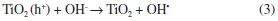 Os espectros indicam que um aumento na concentração de Ti na matriz provoca uma diminuição nas intensidades de fotoluminescência. Isto sugere que os materiais ST possuem propriedades ópticas diferentes dos seus óxidos puros, no caso o material STc apresenta uma intensidade de fotoluminescência menor que o TiO2 (P-25). Assim, o material nanoestruturado STc deve possuir uma menor taxa de recombinação (elétron/buraco) e, portanto, uma melhor eficiência quântica.55 Outro fato importante resultante da observação da Figura 4 é que existem processos quânticos ocorrendo em comprimentos de onda na faixa da luz visível. Isto reforça o interesse na utilização destes materiais em reações fotocatalíticas, pois uma vez que apresentam transições na faixa do visível, há a possibilidade de absorverem também em comprimentos de onda na faixa do visível. Podemos dizer então que estes materiais são capazes de absorver radiações na faixa do UV e do visível da luz solar natural. Estudos de fotodegradação Estudo preliminar Um teste fotocatalítico preliminar foi realizado com o corante azul de metileno (AM) em solução aquosa, para se estabelecer qual dos materiais ST apresentava o melhor desempenho na fotodegradação deste corante usando a luz solar natural. O experimento foi realizado da seguinte forma: 0,1 g dos materiais STa, STb e STc e 15,0 mL de uma solução aquosa de azul de metileno na concentração de 1,0 × 10-5 mol L-1 foram colocados em várias placas de Petri separadamente e estes conjuntos foram expostos à luz solar natural por 30 min. Após a irradiação solar, alíquotas do sobrenadante de cada placa foram retiradas e analisadas pela técnica do UV-Vis, utilizando-se a banda de 664 nm. Os valores obtidos de absorvância foram tratados pela Equação 1 e os resultados obtidos foram 72,6, 89,8 e 91,6% para os fotocatalisadores STa, STb e STc, respectivamente. A maior eficiência fotocatalítica do material STc pode ser atribuída à maior concentração de Ti e ao menor valor de band gap do material. Além disso, com a inserção de TiO2 em uma matriz de sílica, o material pode apresentar ligações do tipo Si-O-Ti-OH na superfície, o que promove o aparecimento de sítios com alta acidez de Bronsted.56 As regiões contendo as ligações Si-O-Ti-OH, por estarem muito próximas aos sítios fotoativos do TiO2, produtores de radicais hidroxila, podem favorecer a degradação das moléculas do corante. Desta forma, os materiais contendo estas ligações mostram-se mais efetivos na oxidação de compostos quanto comparados ao TiO2 e SiO2 isolados.56 Um esquema do mecanismo de fotodegradação do sistema SiO2/TiO2 é mostrado na Figura 5.