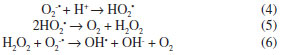 Os corante AM e AR apresentaram um tempo de fotodegradação de 90 min e o corante AO um tempo de 45 min, como pode ser observado na Figura 6A. Características inerentes ao corante como estrutura das moléculas, natureza dos grupos funcionais, absortividade molar, solubilidade e pureza dos reagentes são fatores que podem atuar diretamente na fotodegradação desses compostos, resultando neste perfil de degradação. Os sobrenadantes, após os tempos de irradiação solar correspondentes à total degradação de cada corante, foram analisados por TOC, pelo método da combustão catalítica a alta temperatura, e o resultado obtido foi negativo para carbono orgânico, indicando que o resultado do UV-Vis pode ser utilizado neste caso como o final da fotodegradação das moléculas orgânicas de corante. Foi observado que o fotocatalisador não apresentava qualquer coloração após os tempos de irradiação solar, usados para a total degradação das moléculas dos corantes em solução. Desta forma, quando determinamos por UV-Vis o final da fotodegradação, a análise por TOC do extrato confirma a total mineralização do corante nestas condições experimentais pelo fotocatalisador STc. Efeito do pH A influência do pH da solução aquosa do corante no desempenho fotocatalítico é mostrada na Figura 6B. Para o estudo da influência do pH da solução aquosa de corante os tempos de irradiação solar foram fixos, sendo de 90 minutos para o AM e AR e de 45 minutos para o AO. De acordo com a Figura 6B, a fotodegradação é mais efetiva para valores de pH acima de 5,0 para os corantes AO e AM e acima de 4,0 para o corante AR. O valor do pH das soluções dos corantes, sem ajustes adicionais, é de 5,9. O perfil do comportamento da fotodegradação dos corantes em relação ao pH da solução indica que em valores menores de 4,0 (para AR) e de 5,0 (para AO e AM) existe uma forte competição entre os prótons da solução e as moléculas dos corantes catiônicos pelos sítios ativos da superfície do fotocatalisador, diminuindo assim a concentração das moléculas dos corantes sobre a superfície do fotocatalisador e consequentemente diminuindo a eficiência fotocatalítica.59,60 Em meio básico o processo de fotodegradação é mais eficiente, devido, provavelmente, ao fato das hidroxilas presentes no meio poderem reagir com os buracos fotogerados (h+) na superfície do fotocatalisador e produzir mais radicais hidroxila, conforme a Equação 3.61 ![]() As reações em meio ácido proporcionam a formação de radicais hidroxila de forma bem mais lenta e em menor quantidade, como representado nas Equações 4 a 6.61 ![]() Efeito da variação da concentração inicial do corante Os estudos da variação da concentração inicial dos corantes também foram realizados fixando-se o tempo de irradiação solar. Para a solução de AM e AR o tempo de irradiação solar utilizado foi de 90 minutos e para as soluções de AO foi de 45 minutos. As concentrações das soluções dos corantes variaram de 1,0 × 10-5 a 8,0 × 10-5 mol L-1 para AM, de 1,0 × 10-5 a 5,6 × 10-5 mol L-1 para AR e de 1,0 × 10-5 a 8,0 × 10-5 mol L-1 para AO. De acordo com a Figura 6C, quanto maior a concentração inicial do corante menor a taxa de degradação nos tempos fixos utilizados. Considerando que a superfície do catalisador possui características adsorventes (sítios ácidos), um aumento da concentração dos corantes em solução provoca a diminuição da geração de radicais hidroxila na superfície dos catalisadores, uma vez que todos os sítios estão ocupados por moléculas de corante resultando, portanto, em menor eficiência fotocatalítica. Além disso, as moléculas de corante podem absorver a radiação UV e funcionar como uma barreira para a irradiação solar do fotocatalisador, consequentemente causando uma redução na produção de radicais como OH e O2.18,62 Estudo cinético Em estudos da cinética de fotodegradação de corantes, é comumente aceito que este processo obedeça a cinética de pseudo-primeira ordem.7,12,33,57,63 O modelo cinético de primeira ordem aparente pode ser representado pelo gráfico ln(C0/C) versus o tempo de exposição solar, onde C0 é a concentração inicial do corante e C é a concentração do corante após um determinado tempo de irradiação.33 Desta forma, a fim de verificar se este tipo de cinética se aplica ao presente caso, foram aplicados os modelos cinéticos de primeira ordem, segunda ordem e primeira ordem aparente aos dados experimentais. Os modelos de primeira ordem e de segunda ordem não apresentaram correlação com os dados do processo de fotodegradação dos corantes, somente o modelo de primeira ordem aparente. O gráfico ln(C0/C) versus t é mostrado na Figura 5S (material suplementar on line). Os coeficientes de correlação linear (R2) e as constantes de velocidade são mostrados na Tabela 1S (material sumplementar on line). Os valores da constante de velocidade obtidos foram 5,72 × 10-2 min-1 para o AM, 6,44 × 10-2 min-1 para o AR × 1,07 x 10-1 min-1 para o AO. Isto sugere que a absortividade molar dos corantes pode influenciar diretamente na cinética de fotodegradação, pois o corante AO que possui a menor absortividade molar dentre os corantes utilizados, como mostrado na Tabela 1S (material suplementar on line), é o corante que se degrada mais rapidamente (45 min). Recuperação e reutilização do fotocatalisador Um dos aspectos mais importante nos processos de fotodegradação é a facilidade de recuperação e a possibilidade de reutilização do fotocatalisador. Verificamos que o fotocatalisador STc pode ser reutilizado mais de 50 vezes sem perda significativa da sua eficiência fotocatalítica. A comparação dos tempos de contato necessários para a degradação total do corante AM no primeiro ciclo de utilização do material com o tempo de contato do ciclo número 50 demonstrou uma perda de eficiência menor do que 2%. I