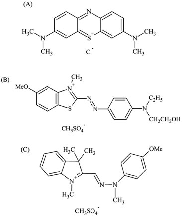 ![]() Figura 1. Estrutura dos corantes AM (A), AR (B) e AO (C)