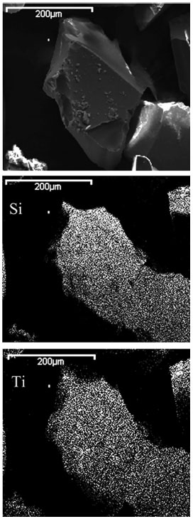 ![]() Figura 2. Imagem de MEV e os mapeamentos dos elementos Si e Ti na partícula do STc