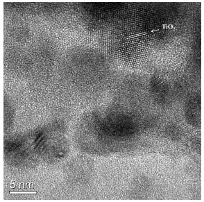 As imagens mostram que os elementos se encontram altamente dispersos pela partícula e nenhuma evidência da presença de aglomerados pode ser observada na magnificação utilizada. O espectro de refletância difusa foi obtido para cada material ST e a partir da aplicação da função de Kubelka-Munk e do modelo de Tauc, baseado na Equação 2,47-49 foram calculados os valores de band gap dos materiais. ![]() Na equação 2 temos: α igual ao coeficiente de absorção da amostra; h igual à constante de Plank; ν igual à frequência; B igual ao fator de desordem e E igual à energia. Fazendo-se o gráfico (f(R) hν)1/2 versus E e a extrapolação da reta dos dados obtidos foi possível determinar os valores de band gap para os materiais ST, como mostrado na Figura 3S (material suplementar on line). Os valores obtidos do band gap (Bg) para os materiais foram: 3,20 ± 0,01, 2,92 ± 0,02 e 2,85 ± 0,01 eV para os materiais STa, STb e STc, respectivamente. Observa-se que quanto maior o teor de SiO2 no material maior será o valor de band gap. Isso pode ser devido ao fato de a sílica exercer um papel dispersante e isolante no material, provocando um efeito de confinamento quântico, ou seja, reduzindo o tamanho das partículas de TiO2 e consequentemente aumentando a energia de separação entre as bandas de valência e de condução.30 Os difratogramas dos materiais ST são mostrados na Figura 4S (material suplementar on line). Os espectros de difração de raios-X dos materiais ST mostram apenas o halo amorfo típico da sílica entre 15º e 30º (2θ), sem evidências de planos cristalinos nos materiais.50 Isso pode reforçar os indícios de que os cristalitos de TiO2 presentes no material são de fato de tamanho muito pequeno e estão bastante diluídos na matriz, não sendo possível identificá-los pelo método de difração de raios-X de pó convencional. Os espectros de Raman-FTIR dos materiais ST mostram a existência da fase anatase do TiO2 como pode ser visto na Figura 5S (material suplementar on line). As bandas em 516 cm-1 e 641 cm-1 podem ser atribuídas aos modos A1g e Eg do TiO2 na fase anatase.51-53 A banda em 960 cm-1 pode ser atribuída ao estiramento das ligações Si-OH na superfície54 dos materiais e, com o aumento do teor de Ti nas amostras, esta banda diminui a sua intensidade. Isto mostra que com o aumento da quantidade de titânio na matriz de sílica ocorrem alterações na superfície dos materiais, diminuindo a quantidade de grupos silanóis. Observa-se ainda que com a maior concentração de Ti no material os picos referentes à fase anatase tornam-se mais intensos, indicando que uma maior quantidade desta fase está presente no material ST. A imagem de HRTEM do material STc é apresentada na Figura 3.