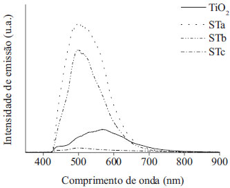 ![]() Figura 4. Espectros de emissao de fotoluminescência para os materiais ST e TiO2 (P- 25)