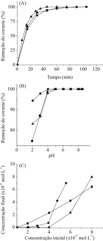 ![]() Figura 6. Fotodegradaçao dos corantes AM (■), AR (●) e AO (▲) em soluçao aquosa em funçao do tempo de exposiçao solar (A); variando-se o pH da soluçao de 2,0 a 8,5 e com o tempo fixo de 90 min para o AM e AR e 45 min de irradiaçao para AO (B) e o efeito da concentraçao inicial do corante, com tempo fixo de 90 min para o AM e AR e 45 min de irradiaçao para o AO (C) utilizando em todos os casos o fotocatalisador STc