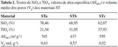 RESULTADOS E DISCUSSÃO Nesta seção, é apresentada a caracterização dos materiais sintetizados, a fim de investigar a sua estrutura química e morfologia, assim como suas propriedades óticas. Posteriormente, é avaliado o potencial de fotodegradação dos corantes têxteis azul de metileno, azul royal GRL e amarelo ouro GL pelo material STc e a luz solar natural e também os fatores que podem influenciar neste processo, como o pH da solução de corante e a concentração do corante em solução. A cinética do processo de fotodegradação também é avaliada. Caracterização Os teores de SiO2 e TiO2 obtidos por EDXRF nos materiais STa, STb e STc são mostrados na Tabela 1.