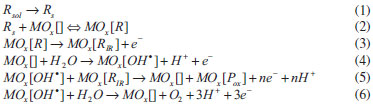 Departamento de Química, Universidad Simón Bolívar, Caracas, Venezuela Recebido em 12/01/2015 *e-mail: ronaldvargas@usb.ve The electrochemical oxidation of lambdacyhalotrin in a triton X-100 water solution on a PbO2-Bi electrode has been studied. It was discovered that electrocatalytic degradation proceeded through the Langmuir-Hinshelwood (L-H) mechanism. The Langmuir adsorption equilibrium constant of the organic compound on the PbO2-Bi surface (0.67 (±0.02) mg-1 L) and the L-H maximum reaction rate for lambdacyhalotrin oxidation (0.040 (±0.002) mg L-1 min-1) was also determined on the basis of kinetic data. Oxidation/mineralization was tested at electrode potential higher than 2.3 V vs. Ag/AgCl, in this conditions the higher degradation percent of 85 (±4) % has been obtained. INTRODUCCIÓN La oxidación electroquímica de compuestos orgánicos por transferencia de oxígeno se basa en la formación de especies intermediarias altamente reactivas, como lo son principalmente los radicales hidroxilo (OH). Dichos radicales son los que llevan a cabo la descomposición de los agentes contaminantes, luego de reaccionar con los compuestos orgánicos adsorbidos sobre una superficie electrocatalítica. Básicamente el método consiste en aplicar sobre el electrodo de trabajo (típicamente dióxido de plomo modificado con bismuto, dióxido de estaño dopado con antimonio, carbono vítreo, grafito o diamante dopado con boro), un potencial positivo de tal manera que se generen radicales OH y se promueva la oxidación de los contaminantes orgánicos en solución.1-13 La oxidación electroquímica de compuestos orgánicos sobre óxidos de metales es precedida por el transporte del reactivo (Rsol) desde el seno de la solución hasta la superficie del electrodo (Rs) (ecuación 1). Posteriormente se establece el equilibrio de adsorción-desorción del compuesto orgánico sobre sitios activos del electrodo (MOX[ ]) (ecuación 2).3,4,8 A potenciales lo suficientemente positivos ocurre la oxidación directa de la materia orgánica adsorbida, formando de esa manera, intermediarios radicales (RIR) (ecuación 3), y paralelo a esto ocurre la descomposición del agua sobre el electrodo, generando así, radicales hidroxilo adsorbidos (ecuación 4).1,2,4,7,8 Estos pueden reaccionar con los intermediarios radicales formados y generar los productos de oxidación (POX) (ecuación 5)3,4,7,8 o con la molécula de agua, con lo cual ocurre la reacción de evolución del oxígeno de forma paralela e inevitable (ecuación 6).1,2,7 ![]() Las reacciones anteriores dependen fuertemente de la actividad electrocatalítica del material electródico.7,8 De los diferentes electrodos que han sido utilizados para este proceso, uno que resulta ventajoso y con proyección a nivel industrial es el de dióxido de plomo modificado con bismuto (PbO2-Bi), ya que presenta bajo costo, se puede sintetizar electroquímicamente in situ sobre diferentes superficies con una metodología bastante sencilla, y tiene una eficiencia representativa para la producción de radicales hidroxilo adsorbidos que favorecen la degradación de la materia orgánica.1,14 Adicionalmente, este material en estado sólido no es perjudicial para el medio ambiente ni para el ser humano, mientras se garanticen las condiciones de operación con potenciales lo suficientemente positivos para evitar la disolución de los metales.14,15 Cabe destacar, que en la literatura se encuentran reportados procedimientos para realizar electrodos de PbO2 con buenas propiedades mecánicas y eléctricas, y así evitar pérdida de materia desde la fase sólida de PbO2 hacia la fase líquida como iones Pb2+.14 Otros electrodos, como el de diamante dopado con boro y el dióxido de estaño dopado con antimonio, resultan tanto o más efectivos que el PbO2-Bi para la oxidación de la materia orgánica, sin embargo, el primero presenta altos costos de producción que no lo hacen accesible para la industrialización, mientras que, el segundo no presenta buena estabilidad mecánica y se deteriora rápidamente en condiciones de evolución de oxígeno.7 La oxidación electroquímica de efluentes industriales, particularmente contaminados con compuestos orgánicos de estructura molecular compleja, resulta factible por su accesibilidad, rentabilidad y eficiencia,7 dicho proceso permite la oxidación completa de sustancias orgánicas a temperatura ambiente, es capaz de destruir compuestos tóxicos como dioxinas, bifenilos policlorados, pesticidas, y diferentes tipos de compuestos aromáticos como nitrofenoles y clorofenoles, entre muchos otros. 6-8,16 En degradación electroquímica de compuestos orgánicos por transferencia de oxígeno, diferentes autores han encontrado experimentalmente, que bajo condiciones donde la velocidad de transporte por difusión no resulta limitante, la reacción entre los compuestos orgánicos y los radicales hidroxilo, ambos adsorbidos, obedece una ley de velocidad de carácter heterogéneo.1-5,8,17-34 Estudios cinéticos de este fenómeno indican que la velocidad de reacción depende, hiperbólicamente, de la concentración del compuesto orgánico según el modelo cinético de Langmuir-Hinshelwood, (ecuación 7). ![]() donde r es la velocidad de reacción, c la concentración del compuesto orgánico, k es la constante de velocidad aparente de la reacción superficial entre radicales hidroxilo y compuesto orgánico y K es la constante de equilibrio de adsorción-desorción del compuesto orgánico sobre la superficie del electrocatalizador. Considerando la buena correspondencia de los datos experimentales para una gran variedad de compuestos orgánicos y materiales de electrodos, 1-5,8,17-34 se plantea que en la oxidación de compuestos orgánicos debe establecerse un equilibrio de adsorción-desorción relativamente rápido entre el compuesto orgánico y el electrodo (ecuación 2); luego puede ocurrir la oxidación directa tanto de la materia orgánica adsorbida como 