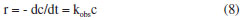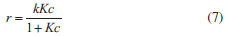 Se obtuvo entonces que los valores para la constante de velocidad a cobertura máxima (k) y la constante de adsorción de Langmuir (K) son: (0,040 ± 0,002) mg L-1 min-1 y (0,67 ± 0,02) mg-1 L respectivamente. Con estos valores se representó el modelo L-H (ecuación 7) en la Figura 4, se puede observar que el modelo de Langmuir-Hinshelwood describe el comportamiento de los resultados experimentales; la velocidad de reacción aumenta con la concentración de lambdacialotrina, pues existe mayor cantidad de materia para adsorberse, sin embargo esta reacción está limitada por la superficie del electrodo y la competencia entre los estados adsorbidos, por tanto, una vez que se alcanza la saturación superficial, la velocidad de reacción se establece en un valor estacionario. Es por ello que, cuando KC << 1 se establecieron las condiciones experimentales donde el insecticida lambdacialotrina disminuyó su concentración en proporciones superiores al 85 (±4) %, en esta situación la constante de reacción de pseudo primer orden medida experimentalmente tiende a su máximo valor kobs = kK = 2,68 x 10-2 min-1.