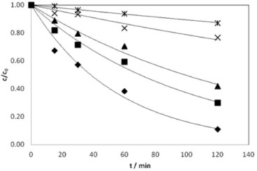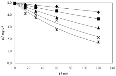 ![]() Figura 3. Efecto de la concentración durante la oxidación electroquímica de lambdacialotrina sobre PbO2-Bi (E0 = 2,3 V). (♦) 1 mg L-1, (■) 3 mg L-1, (▲) 5 mg L-1, (×) 15 mg L-1, (*) 30 mg L-1, () Ajuste cinético de pseudo primer orden