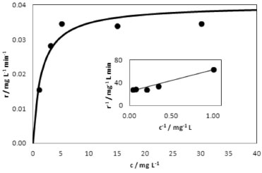 En la ecuación 7, r (mg L-1 min-1) es la velocidad de reacción, c (mg L-1) es la concentración del compuesto orgánico, k (mg L-1 min-1) es la velocidad de reacción a máxima cobertura y K (mg-1 L) es la constante de equilibrio de adsorción de Langmuir. De acuerdo a esto, se puede decir que la velocidad de reacción tenderá a una cinética de primer orden cuando se cumpla que: Kc << 1, y no dependerá de la concentración del sustrato cuando se cumpla: Kc >> 1. Para hallar los parámetros del modelo L-H, se obtuvieron primero los valores de velocidad de reacción inicial (r0), para la cual se midió la pendiente en los instantes iniciales de una representación concentración vs. tiempo de electrólisis para cada experimento a diferentes concentraciones iniciales de lambdacialotrina. De acuerdo a la forma lineal de ecuación 7 (1/r vs. 1/c), a través de un ajuste lineal resultó posible obtener los parámetros cinéticos del modelo L-H (k y K). La Figura 4 muestra la representación de los datos experimentales de velocidad de reacción vs. concentración, se observa que a concentraciones bajas la velocidad se incrementa con un aumento de la concentración, y a concentraciones elevadas se observa que la velocidad tiende asintóticamente a un valor constante. En el inserto se puede observar el gráfico de r-1 vs c-1, el cual muestra la correspondencia y aplicabilidad que tiene la correlación de los datos experimentales con el modelo cinético de Langmuir-Hinshelwood en su forma lineal.