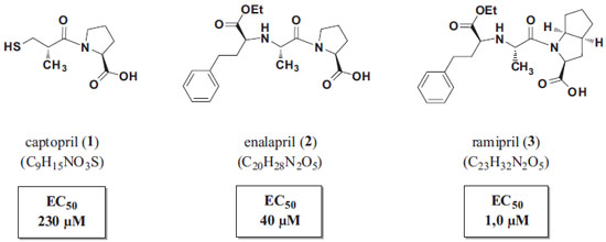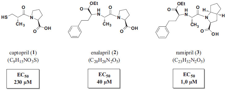 Figura 1. Captopril, enalapril e ramipril, iECAs utilizados na terapêutica com seus respectivos valores de concentração efetiva 50% (EC50)11